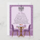 © Socialite Designs. Un elegante diseño de invitación a la fiesta del té que incluye un diseño de mesa antigua, papel pintado damasco, un ambiente de té con pastelitos y lámpara de araña en lavanda, marrón y negro. Personalice esta invitación con su propio texto para cualquier evento de fiesta de té. Añade tu propio toque personal añadiendo adornos como cintas, diamantes de imitación o flores de papel.