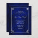Esta es una invitación elegante y lujosa para celebrar Bodas de Plata, ideal para cualquier época del año. Un marco geométrico de plata con adornos en las esquinas encierra su texto, también en plata. Las imágenes y el texto están colocados sobre un fondo degradado azul real que casi brilla. La parte trasera de la invitación tiene el mismo fondo azul. ¡Muy elegante!