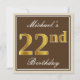 Este sencillo y elegante diseño de invitación para fiestas de cumpleaños incluye un mensaje personalizado como "Cumpleaños 22 de Michael" (el "22" tiene un aspecto falso/imitación de color dorado) dentro de un área cuadrada de color marrón con un simple contorno fronterizo. El nombre se encuentra en un texto elegante de color blanco tipo script, y se puede personalizar. En la parte posterior se incluyen detalles de invitación personalizados. Una invitación para una fiesta de cumpleaños como esta podría ser usada tal vez cuando se invita a la gente a una fiesta de cumpleaños para alguien que está celebrando su vigésimo segundo cumpleaños. [~Z0000229]