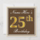 Este sencillo y elegante diseño de invitación para fiestas de cumpleaños incluye un mensaje personalizado como "Name-Here's 25th Birthday" (el "25th" tiene un aspecto de color falso/imitación de oro) dentro de un área cuadrada de color marrón con un simple contorno de frontera. El nombre se encuentra en un texto elegante de color blanco tipo script, y se puede personalizar. En la parte posterior se incluyen detalles de invitación personalizados. Una invitación para una fiesta de cumpleaños como esta podría ser usada tal vez cuando se invita a la gente a una fiesta de cumpleaños que se lleva a cabo para alguien que está celebrando su vigésimo quinto cumpleaños. [~Z0000229]