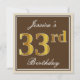 Este sencillo y elegante diseño de la fiesta de cumpleaños incluye un mensaje personalizado como "El cumpleaños número 33 de Jessica" (el "33" tiene un aspecto de color falso/imitación dorado) dentro de una zona cuadrada marrón con un simple contorno fronterizo. El nombre se encuentra en un texto elegante de color blanco tipo script, y puede ser personalizado. En la parte posterior se incluyen detalles de la invitación al personalizable. Una invitación de cumpleaños como esta podría ser usada cuando se invita a la gente a una fiesta de cumpleaños para alguien que está celebrando su 33 cumpleaños. [~Z0000229]