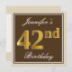 Este sencillo y elegante diseño de invitación para fiestas de cumpleaños incluye un mensaje personalizado como "42º cumpleaños de Jennifer" (con el "42º" con un toque de color falso/imitación dorado) dentro de un área cuadrada de color marrón con un sencillo contorno fronterizo. El nombre se encuentra en un texto elegante de color blanco tipo script, y se puede personalizar. En la parte posterior se incluyen detalles de invitación personalizados. Una invitación para una fiesta de cumpleaños como esta podría ser usada tal vez cuando se invita a la gente a una fiesta de cumpleaños que se lleva a cabo para alguien que está celebrando su cuarenta segundo cumpleaños. [~Z0000229]