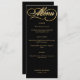 Un elegante y formal menú de boda negro con un guión falso de caligrafía dorada.