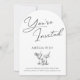 Celebre con estilo con esta invitación elegante y moderna en forma de arco que presenta una escritura elegante que anuncia "Está Invitado" junto a una fuente serif limpia para los detalles de la fiesta. Los cócteles ilustrados añaden un toque juguetón, lo que la hace perfecta para cumpleaños importantes o reuniones sofisticadas. El diseño monocromático en blanco y negro irradia un encanto atemporal, mientras que el formato arqueado añade un elemento trendy y único. Personalice los detalles para una invitación personalizada que sea perfecta para una celebración de cumpleaños número 21 o cualquier ocasión especial.