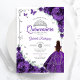 Invitación a la celebración de Quinceanera morado, plateado y blanco. Cuenta con chica de morena en vestido de bata de bola, fuente de guión, mariposas plateadas, rosas púrpura y tiara. Perfecto para una elegante celebración de glam al estilo de la princesa. Personaliza con tus propios detalles. Invitaciones Zazzle impresas o una plantilla imprimible digital de descarga instantánea.