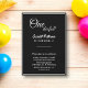 Esta elegante invitación al cumpleaños en blanco y negro es perfecta para un cumpleaños moderno. el diseño es sencillo y elegante, con una caligrafía blanca sobre un fondo negro.