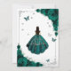 Invitación a la celebración de Quinceanera verde esmeralda, plata y blanco. Cuenta con chica de brunette en vestido de bata de bola, fuente de guión, mariposas plateadas, rosas verdes y tiara. Perfecto para una elegante celebración de glam al estilo de la princesa. Personaliza con tus propios detalles. Invitaciones Zazzle impresas o una plantilla imprimible digital de descarga instantánea.