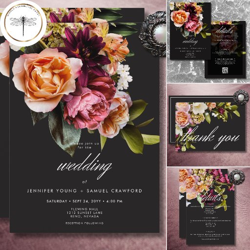 Celebra el amor con elegancia eterna. Nuestra cautivadora invitación a la boda cuenta con un sofisticado fondo negro, la paleta perfecta para un fascinante ramo. Imaginen un arreglo de esquina de flores realistas rosas, borgoñas y blancas cremosas con follaje verde oliva oscuro, creando una sensación de opulencia tranquila. Este encantador diseño prepara el escenario para una reunión íntima llena de momentos sentidos y recuerdos preciados. Creado por Simply Farmhouse Press.