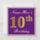 Este sencillo y elegante diseño de invitación para fiestas de cumpleaños incluye un mensaje personalizado como "Cumpleaños 10 de la marca Name-Here" (el "décimo" tiene un aspecto de color falso/imitación de oro) dentro de un área cuadrada de color morado con un sencillo contorno fronterizo. El nombre se encuentra en un texto elegante de color blanco tipo script, y se puede personalizar. En la parte posterior se incluyen detalles de la invitación al personalizable. Una invitación para una fiesta de cumpleaños como esta podría ser usada tal vez cuando se invita a la gente a una fiesta de cumpleaños para alguien que está celebrando su décimo cumpleaños. [~Z0000226]