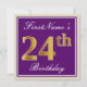 Este sencillo y elegante diseño de invitación para fiestas de cumpleaños incluye un mensaje personalizado como "Cumpleaños 24 de FirstName" (con el "24" con un aspecto de color falso/imitación de oro) dentro de un área cuadrada de color morado con un simple contorno fronterizo. El nombre se encuentra en un texto elegante de color blanco tipo script, y se puede personalizar. En la parte posterior se incluyen detalles de la invitación al personalizable. Una invitación de cumpleaños como esta podría ser usada cuando se invita a la gente a una fiesta de cumpleaños para alguien que está celebrando su vigésimo cuarto cumpleaños. [~Z0000226]