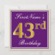 Este sencillo y elegante diseño de invitación para fiestas de cumpleaños incluye un mensaje personalizado como "Cumpleaños 43 de FirstName" (con el "43" con un aspecto de color falso/imitación de oro) dentro de un área cuadrada de color morado con un simple contorno de borde. El nombre se encuentra en un texto elegante de color blanco tipo script, y se puede personalizar. En la parte posterior se incluyen detalles de la invitación al personalizable. Una invitación para una fiesta de cumpleaños como esta podría ser usada tal vez cuando se invita a la gente a una fiesta de cumpleaños que se lleva a cabo para alguien que está celebrando su cuarenta y tres años. [~Z0000226]