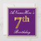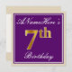 Este sencillo y elegante diseño de invitación para fiestas de cumpleaños incluye un mensaje personalizado como "ANameHere's 7th Birthday" (con el "7th" con un aspecto de color falso/imitación de oro) dentro de un área cuadrada de color púrpura con un simple contorno fronterizo. El nombre se encuentra en un texto elegante de color blanco tipo script, y se puede personalizar. En la parte posterior se incluyen detalles de la invitación al personalizable. Una invitación para una fiesta de cumpleaños como esta podría ser usada tal vez cuando se invita a la gente a una fiesta de cumpleaños para alguien que está celebrando su sétimo cumpleaños. [~Z0000226]