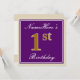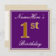 Este sencillo y elegante diseño de invitación para fiestas de cumpleaños incluye un mensaje personalizado como "NameHere's 1st Birthday" (con el "1st" con un aspecto de color falso/imitación de oro) dentro de un área cuadrada de color púrpura con un simple contorno de borde. El nombre se encuentra en un texto elegante de color blanco tipo script, y se puede personalizar. En la parte posterior se incluyen detalles de la invitación al personalizable. Una invitación para una fiesta de cumpleaños como esta podría ser usada tal vez cuando se invita a la gente a una fiesta de cumpleaños para alguien que está celebrando su primer cumpleaños. [~Z0000226]