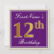 Este sencillo y elegante diseño de invitación para fiestas de cumpleaños incluye un mensaje personalizado como "Cumpleaños 12 de FirstName" (con el "duodécimo" con un aspecto de color falso/imitación de oro) dentro de un área cuadrada de color morado con un simple contorno de borde. El nombre se encuentra en un texto elegante de color blanco tipo script, y se puede personalizar. En la parte posterior se incluyen detalles de invitación personalizados. Una invitación para una fiesta de cumpleaños como esta podría ser usada tal vez cuando se invita a la gente a una fiesta de cumpleaños para alguien que está celebrando su duodécimo cumpleaños. [~Z0000226]