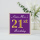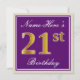 Este sencillo y elegante diseño de invitación para fiestas de cumpleaños incluye un mensaje personalizado como "Name-Here's 21st Birthday" (el "21st" tiene un aspecto de color falso/imitación de oro) dentro de un área cuadrada de color morado con un sencillo contorno de borde. El nombre se encuentra en un texto elegante de color blanco tipo script, y se puede personalizar. En la parte posterior se incluyen detalles de la invitación al personalizable. Una invitación para una fiesta de cumpleaños como esta podría ser usada tal vez cuando se invita a la gente a una fiesta de cumpleaños para alguien que está celebrando su 21º cumpleaños. [~Z0000226]