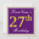 Este sencillo y elegante diseño de invitación para fiestas de cumpleaños incluye un mensaje personalizado como "Cumpleaños 27 de FirstName" (con el "27" con un aspecto de color falso/imitación de oro) dentro de un área cuadrada de color morado con un simple contorno de borde. El nombre se encuentra en un texto elegante de color blanco tipo script, y se puede personalizar. En la parte posterior se incluyen detalles de invitación personalizados. Una invitación de fiesta de cumpleaños como esta podría ser usada tal vez cuando se invita a la gente a una fiesta de cumpleaños que se lleva a cabo para alguien que está celebrando su vigésimo séptimo cumpleaños. [~Z0000226]
