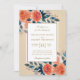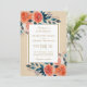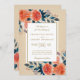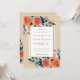 El diseño de esta invitación a la boda incluye flores naranjas acuáticas y follaje azul sobre un hermoso fondo crema.