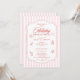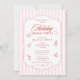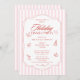 Elegantes invitaciones para fiestas navideñas de Navidades corporativos presentan elementos sencillos y extravagantes de Navidades rojos sobre un fondo rayado rosa y blanco con el texto "Fiesta de cena de vacaciones" en elegante tipografía de caligrafía roja. Elegante, moderno y moda para su fiesta de vacaciones corporativa. Creado por Evco Studio www.zazzle.com/store/evcostudio