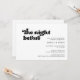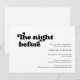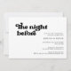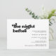 La noche anterior... Asegúrate de que todo sea perfecto para el gran día; recibe invitaciones modernas para tu cena de boda. Un tema de moda retro: adoptar este diseño tipográfico algo vintage y de diseño para tu papelería boda, con una temática clásica en blanco y negro. Personalizable de texto, colores y fondos.
