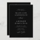 Elegantes invitaciones de boda todo en uno con sus nombres e información de la ceremonia boda en el frente con letras blancas con fondo negro. Un guión moderno de caligrafía completa el aspecto de esta invitación a la boda en blanco y negro de moda. Personalice la parte posterior de las invitaciones de boda caligráficas con detalles bodas como información de recepción, alojamiento de hotel, instrucciones RSVP y sitio web de bodas. Agregue el enlace deseado del sitio web del boda a la plantilla de código QR proporcionada para que sus huéspedes puedan ver fácilmente RSVP en línea y obtener información adicional sobre el boda. Esta invitación de boda en blanco y negro con código QR es perfecta para bodas formales e informales de cualquier temporada.