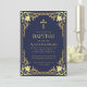 Esta elegante invitación al bautismo de color azul marino y oro con un aire vintage, recomendada para un niño, tiene un marco de Relieve metalizado de imitación dorado ornamentado con elegantes decoraciones barrocas doradas sobre un fondo azul marino. Encima del texto hay una cruz religiosa en falso Relieve metalizado de oro. Excepto la ocasión "Bautismo", que es también en oro falso, todo el texto puede ser personalizado y tiene un color amarillo dorado similar al marco falso oro. El marco vintage, ornamentado, se basa en un enlace de portada de libros antiguos franceses, de Georges Mercier (1885-1939) - Madame de Maupin por Theophile Gautier, edición 1911, ahora de dominio público.