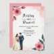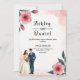 Esta elegante invitación a una boda floral acuática es perfecta para un boda moderno. El diseño romántico presenta un marco floral de color agua elegante con un ilustracion de novia y novio y una caligrafía negra con un fondo blanco.