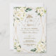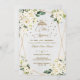 Elegante diseño de tarjeta con hermosas acuarelas blancas, crema, ramos de flores de marfil, un falso marco poligonal de oro, divisor floral, confetti de oro falso, hermoso guión de escritura a mano, en la corona floral dorada y nombre; todo sobre fondo de papel acuarela. Utilice la herramienta Personalize para agregar su información. Vea también mi colección de Fiestas Quinceañera y Sweet Sixteen.