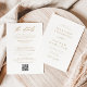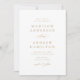 Elegantes invitaciones de boda todo en uno con sus nombres e información de la ceremonia boda en el frente con letras doradas con fondo blanco. Un guión moderno de caligrafía completa el aspecto de esta invitación a la boda de oro de moda. Personalice la parte posterior de las invitaciones de boda caligráficas con detalles bodas como información de recepción, alojamiento de hotel, instrucciones RSVP y sitio web de bodas. Agregue el enlace deseado del sitio web del boda a la plantilla de código QR proporcionada para que sus huéspedes puedan ver fácilmente RSVP en línea y obtener información adicional sobre el boda. Esta invitación a la boda en código QR es perfecta para bodas formales e informales de cualquier temporada.