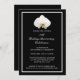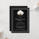 Una invitación de celebración del 50 aniversario de boda con una orquídea blanca sobre negro.