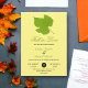 Esta elegante invitación a la boda de otoño es perfecta para un boda moderno de otoño. El diseño es sencillo, con hojas de otoño verdes y una tipografía elegante en negro y verde sobre un fondo amarillo claro.