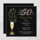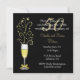 Invitación chic para la fiesta del quincuagésimo aniversario de bodas, realizada en negro y dorado. Gráficos de una copa festiva de champán decorada con un lazo dorado en el tallo y destellos que salen de la parte superior, adornan el lado izquierdo de la invitación negra. El texto en blanco y dorado es totalmente personalizable para adaptarse a las necesidades de su evento.