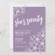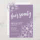 Elegante 70 días de fiesta púrpura 70. Una divertida pero elegante invitación para la fiesta de cumpleaños número 70 con flores moradas y blancas para los jóvenes en el corazón. Un patrón de flores juguetón enmarca una tipografía de escritura "ella tiene setenta" mezclada con un tipo de letra serif más clásico. Celebra setenta años de vida con este hermoso diseño botánico. La parte divertida es que puedes cambiar TODOS los colores. No sólo se pueden cambiar los colores de fondo y el tipo de letra, sino que también se pueden cambiar las líneas de las flores. Disponible en forma de invitación impresa, o como una invitación digital descargable que puede enviar por correo electrónico o que ha impreso localmente.