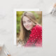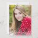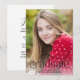 Esta minimalista tarjeta de graduación incluye una tipografía de moda y una gran foto. En la parte delantera, "Graduado" está escrito con letras negras únicas con un gran florecimiento. El año de graduación está dentro del florecimiento, y el nombre del graduado y la escuela están abajo. El diseño tipográfico sobrepone una gran foto vertical. La parte posterior de la tarjeta de graduación incluye una plantilla para agregar detalles de la fiesta de graduación.