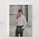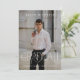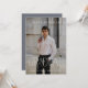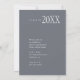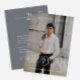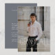Esta moderna invitación a una fiesta de graduación fotográfica incluye una foto completa con elegante tipografía de graduación en la parte delantera, y detalles de una fiesta de graduación con la espalda azul de pizarra.