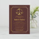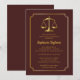 Escala legal de la biblioteca de oro de la justicia y diseño de invitación a fiesta de graduación de marrón con marco de oro y marco de vieira que puede ser personalizado para graduaciones de derecho u otras graduaciones de escuelas de campo legal. Diseño compuesto por Holiday Hearts Designs (derechos reservados).