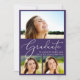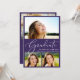 Una moderna invitación a una fiesta de graduación morada que incluye un collage de 3 fotos del graduado repleto de "Graduado" en un elegante guión en blanco, y su nombre, año de clase y escuela con letras blancas limpias. En la parte posterior, agregue una foto adicional y personalice los detalles de su fiesta.
