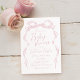 Elegantes invitaciones para duchas para bebés presentan un arco de cinta dibujado a mano con letras escritas a mano modernas en rosa suave. dulce y simple. Ideal para una divertida y original ducha de bebé. Vea todas las piezas coincidentes de la colección.