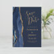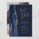 Esta elegante y moderna tarjeta de fecha guarda una barra acuática azul marino bordeada por un falso purpurina de oro. El texto dorado aparece en un fondo azul marino. Reemplace fácilmente la imagen de muestra en la parte posterior con una foto vertical del futuro novio y novia.