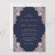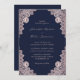 Estas elegantes invitaciones de rosa dorado y azul marino a una boda con un rosa de encaje floral dorado sobre un fondo azul marino son perfectas para invitar a sus invitados a su fiesta de bodas rústica de color azul marino y oro subió.