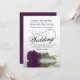 Esta hermosa invitación a la boda cuenta con una magnífica fotografía de un único rosa de color púrpura de ciruela o berenjena de tallo largo sobre su lado, reflejado en un estanque de agua con olas y ondas. El diseño presenta un guión de caligrafía sofisticada con una larga cola rizada que lo hace moderno y clásico. Elegante, sofisticada y moda para invitar a sus amigos y familiares a compartir en su día especial. La parte posterior de la tarjeta tiene un código QR para su sitio web boda y una breve nota que instruye a la gente a visitar el sitio para obtener detalles y RSVP.