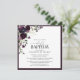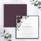 Moderna y elegante invitación cuadrada al bautismo sagrado con un ramo de rosas acuarelas en ciruela morada. Personalice los detalles en un suave color negro, acentuado con una bella caligrafía con letras a mano moderna, bordeada por un violeta profundo. La parte posterior de la tarjeta presenta una textura púrpura que coincide. Copyright Elegant Invita de Anastasia Surridge, todos los derechos reservados.