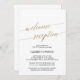 Esta elegante tarjeta de bienvenida dorada caligrafía es perfecta para un evento sencillo. El diseño de los Relieves metalizados de oro falso cuenta con una tarjeta minimalista decorada con tipografía romántica y caprichosa. Nota: Este diseño no tiene Relieve metalizado oro real. Es un gráfico de alta calidad hecho para parecer un Relieve metalizado dorado.