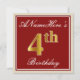 Este sencillo y elegante diseño de invitación para fiestas de cumpleaños incluye un mensaje personalizado como "ANameHere's 4th Birthday" (con el "4th" con un aspecto de color falso/imitación de oro) dentro de un área cuadrada de color rojo con un simple contorno fronterizo. El nombre se encuentra en un texto elegante de color blanco tipo script, y se puede personalizar. En la parte posterior se incluyen detalles de la invitación al personalizable. Una invitación para una fiesta de cumpleaños como esta podría ser usada tal vez cuando se invita a la gente a una fiesta de cumpleaños para alguien que está celebrando su cuarto cumpleaños. [~Z0000227]