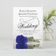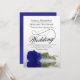 Esta hermosa invitación a la boda incluye una magnífica fotografía de un rosa de tallo largo de color azul real o cobalto sobre su lado, reflejado en un estanque de agua con olas y olas. El diseño presenta un guión de caligrafía sofisticada con una larga cola rizada que lo hace moderno y clásico. Elegante, sofisticada y moda para invitar a sus amigos y familiares a compartir en su día especial. La parte posterior de la tarjeta tiene un código QR para su sitio web boda y una breve nota que instruye a la gente a visitar el sitio para obtener detalles y RSVP.