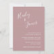 Invitación de boda moderna con un diseño sencillo con sus nombres en un elegante guión manuscrito en la parte superior izquierda y los detalles de su evento en la alineación derecha en la parte inferior derecha. Todos los elementos de diseño están en blanco sobre un fondo rosado rosa polvoriento y pueden cambiarse en la herramienta de edición de diseño. La letra a mano de moda añade un toque romántico a este diseño minimalista.