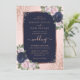 Elegante invitación a una boda floral de color azul marino, dorado y rosa, con arreglos florales con rosas azules y rosas rosas rosas rosas y ruidosas y vegetación.