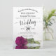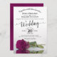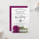Esta magnífica invitación a la boda presenta un moderno diseño floral con una única cassis de tallo largo morado, magenta, ciruela roja o rosa de color berry sobre su lado que refleja una piscina con olas y ondas. El diseño es sencillo, elegante, romántico y sofisticado, con caligrafía de escritura de encaje y contenido de personalizable completo.