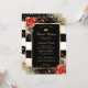Elegante invitación de 16 años de color negro y dorado floral con marco dorado decorado con rosas rojas y confeti.