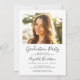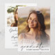 Elegante invitación a una fiesta de graduación con la foto del graduado mostrada con "graduado" en un guión moderno y su nombre y año de clase en simple tipografía. En el reverso, añada una foto adicional y los detalles del fiesta de grado.