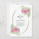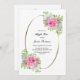 Una elegante invitación de té alto floral rosa enmarcada en oro.